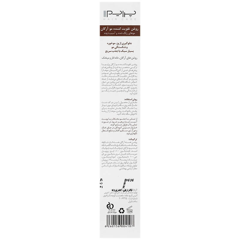 روغن مو آرگان پریم، یک محصول مراقبتی مناسب برای افرادی است که موهای رنگشده، خشک یا آسیبدیده دارند و به دنبال تقویت و محافظت از موهای خود هستند. این روغن مو به حفظ و ماندگاری رنگ مو کمک میکند و از ایجاد موخوره و شکنندگی تارهای مو جلوگیری مینماید. در ترکیبات این محصول از روغن آرگان، دانه انار و میخک استفاده شده است که باعث تغذیه و تقویت موها میشوند. بافت سبک و غیرچرب آن بهسرعت جذب مو شده و احساس سنگینی ایجاد نمیکند. روغن آرگان پریم به ترمیم موهای آسیبدیده کمک کرده و باعث افزایش نرمی، لطافت و درخشندگی موها میشود. همچنین با داشتن ویتامینها و ترکیبات آنتیاکسیدانی، رطوبت مورد نیاز مو را تأمین کرده و از خشکی و کدر شدن آن جلوگیری میکند. این محصول فاقد پارابن، سولفات، الکل و رنگهای مضر است و به همین دلیل برای استفاده روزانه مناسب بوده و به حفظ سلامت ساقه مو کمک میکند.
