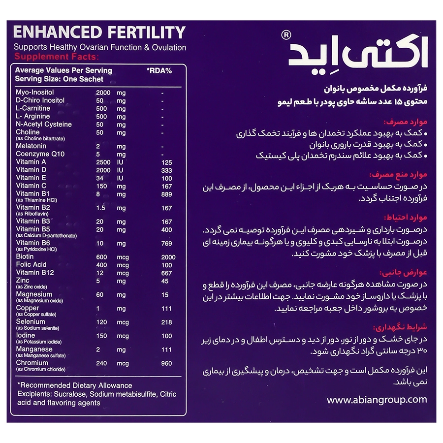 ساشه اکتی اید بانوان ابیان دارو یک مکمل تخصصی و پیشرفته است که به طور ویژه برای حمایت از سلامت سیستم باروری و تخمدان‌ها در زنان فرموله شده است. این محصول با ترکیبات منحصر به فرد خود، به بهبود عملکرد تخمدان‌ها، تنظیم چرخه قاعدگی و تسهیل فرآیند تخمک‌گذاری کمک می‌کند و گزینه‌ای ایده‌آل برای بانوانی است که به دنبال تقویت قدرت باروری و مدیریت علائم مرتبط با سلامت زنان هستند.