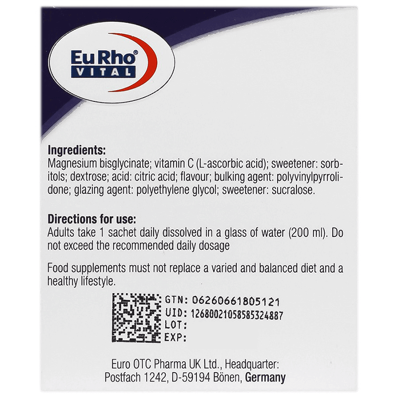 ساشه منیزیم بیس گلایسینات یوروویتال یک مکمل با کیفیت است که منیزیم را به شکلی ارائه میدهد که جذب بالایی دارد و برای معده هم راحتتر است. در ترکیب این محصول ویتامین C هم وجود دارد تا جذب منیزیم بهتر انجام شود و به افزایش انرژی بدن کمک کند.