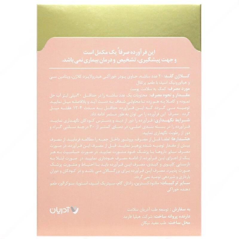 ساشه کلاژن گلد آدریان، یک مکمل غذایی است که به شادابی و سلامت پوست کمک می‌کند. این محصول در بسته‌های ۲۰ عددی و به شکل ساشه‌های آماده مصرف عرضه می‌شود. هر ساشه شامل ۵۰۰۰ میلی‌گرم کلاژن هیدرولیز شده، ۸۰ میلی‌گرم ویتامین C و ۵۰ میلی‌گرم هیالورونیک اسید است.