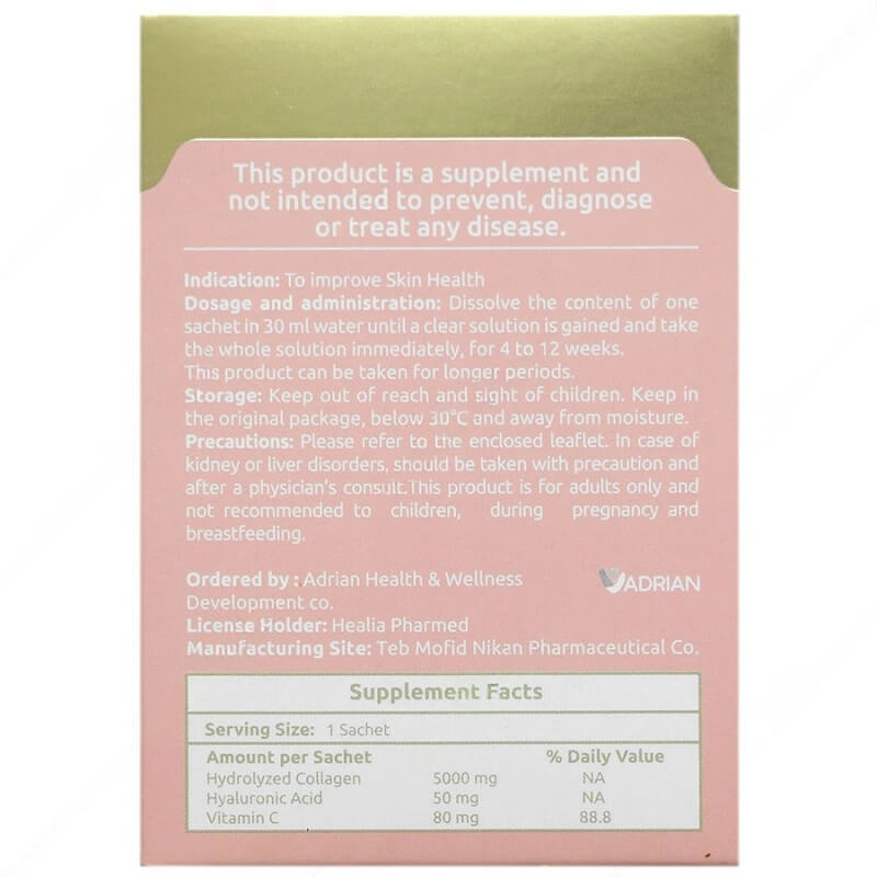 کلاژن موجود در این ساشه باعث کشسانی و جوان ماندن پوست می‌شود و به جلوگیری از پیری زودرس کمک می‌کند. برند آدریان سلامت برای راحتی افرادی که در بلع قرص مشکل دارند، ساشه کلاژن گلد را تولید کرده است.