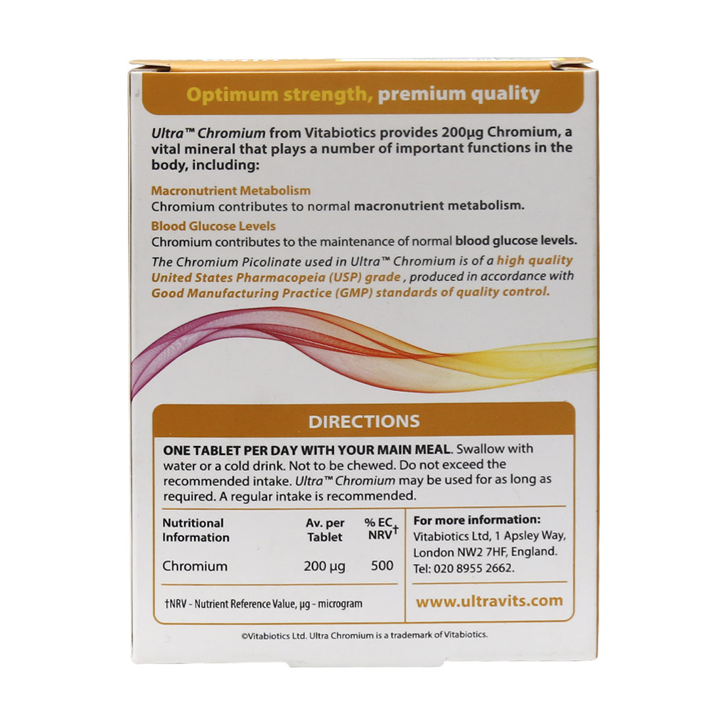 قرص اولترا کروم ویتابیوتیکس، مکملی موثر و منحصر به فرد می باشد که تحت لیسانس شرکت ویتابیوتیکس انگلستان در ایران تولید می گردد. کروم پیکولینات نوعی کروم است که جذب بهتری دارد و به همین دلیل این فرم در مکمل ها بیشتر استفاده می شود. در این محصول ویتابیوتیکس به ازای هر قرص حاوی 200 میکروگرم کروم به فرم پیکولینات می باشد. این مکمل به حفظ میزان گلوکوز خون در سطح نرمال کمک میکند. همچنین میتواند در متابولیسم کربوهیدرات، چربی، پروتئین و افزایش حساسیت به انسولین کمک شایانی کند.