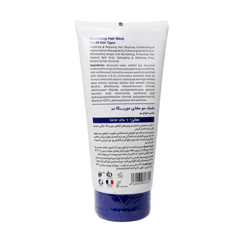 تارهای مو درشرایط آب و هوایی، تغذیه و سبک زندگی در معرض مشکلاتی مانند ریزش مو، وزی، خارش و از دست دادن درخشندگی قرار میگیرند. ماسک مو مغذی شماره ۲ مورینگا امو با داشتن ترکیباتی مانند لافااُیل و روغن جوجوبا مانع از ایجاد موخوره و وز شدن مو می شود. همچنین این ماسک مو مورینگا کمک به ترمیم ساقه و آبرسانی عمقی مو می کند. ماسک مو انواع مو مورینگا امو شامل ترکیباتی مانند روغنهای گیاهی مورینگا، هسته انگور، آرگان، دانه آفتابگردان و ویتامین A و E و روغن دانه جوجوبا می باشد. روغن جوجوبا موجود در ماسک مو انواع مو مورینگا امو رطوبت موها را جبران میکند، بافت موها را بهبود میبخشد و خشکی آن ها را از بین میبرد. همچنین سبب حالت پذیری تارهای موها شده و باعث می شود شانه پذیری موها راحت تر صورت بگیرد.