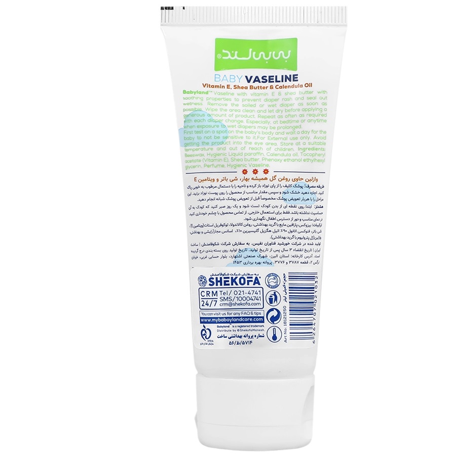 فرمولاسیون تخصصی وازلین کودک حاوی ویتامین E و گل همیشه بهار بیبی لند ، محصولی جهت مراقبت از پوست کودک در برابرخشکی، التهاب و ادرارسوختگی می باشد. ترکیب منحصربه فرد ویتامین E، روغن گل همیشه بهار و شی باتر، سدی محافظ در برابر عوامل تحریک کننده ایجاد کرده و رطوبت پوست را تا ۲۴ ساعت حفظ می نماید.