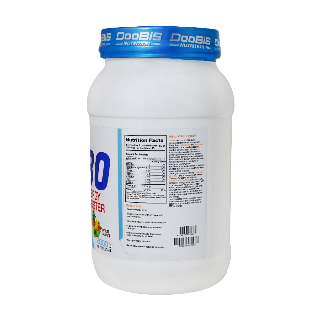 پودر کربو 100 درصد انرژی بوستر دوبیس دارای کالری مفید و غنی برای افزایش وزن، قدرت، ویتامین ها و مواد معدنی بدون کلسترول و چربی و جذب بهتر مواد مغذی است. این محصول نوعی مکمل ورزشی است که از افت سطح قند خون در تمرینات ورزشی شدید جلوگیری میکند. پودر کربو دوبیس شامل کربوهیدراتهایی است که استقامت و انرژی مورد نیاز افراد را در حین تمرین، فراهم میکند.