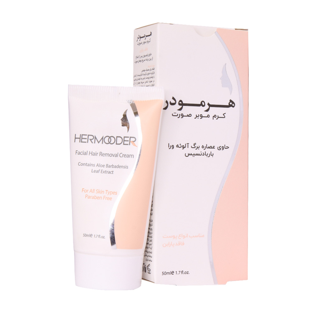 کرم موبر صورت هرمودر حاوی عصاره آلوئه ورا باربادنسیس می‌باشد و برای انواع پوست صورت قابل استفاده است. این محصول موبر دارای خاصیت ضد التهاب و ضد حساسیت و قرمزی پوست است و بدون ایجاد خشکی و حساسیت تمامی موهای زائد را حذف می‌کند.