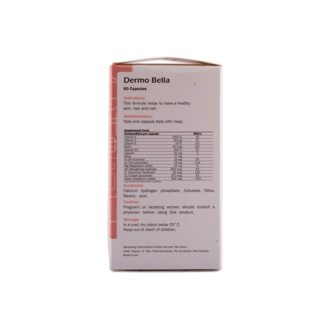 قرص درموبلا شامل ویتامینهایی مثل A ،C ،E ،D و بیوتین است و همچنین مواد معدنی مهمی مانند کلسیم، روی، ید، آهن، منیزیم، منگنز، کروم و مس را در خود دارد. علاوه بر این، سیلیکا هم در ترکیبات آن وجود دارد. این ترکیبات با هم به حفظ سلامت پوست، مو و ناخن کمک میکنند و از مشکلاتی مثل ریزش مو، شکنندگی ناخن و خشکی پوست جلوگیری میکنند.