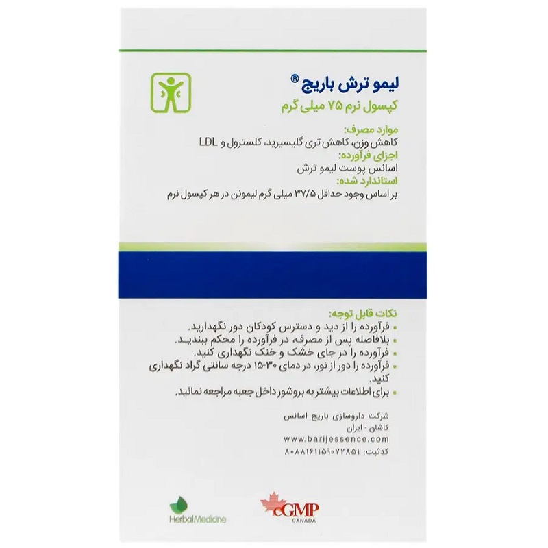 کپسول لیموترش باریج اسانس، یک مکمل طبیعی است که برای کمک به کاهش وزن و کنترل اشتها استفاده میشود. این قرص حاوی 75 و 25 میلیگرم عصاره لیمو ترش است؛ مادهای گیاهی که به دلیل تأثیر مثبت در کم شدن میل به غذا و کمک به چربیسوزی شناخته شده است. در بسیاری از محصولات لاغری، عصاره لیمو ترش معمولاً در کنار زیره به کار میرود، چون این ترکیب میتواند اثر بهتری در کاهش وزن داشته باشد. بررسیها نشان دادهاند مصرف همزمان این دو ماده به مدت چند هفته میتواند به کاهش وزن، کم شدن چربی بدن و بهبود وضعیت قند و چربی خون کمک کند. این محصول توسط شرکت باریج اسانس در ایران تولید و بستهبندی میشود و به صورت قوطیهای پلاستیکی ۶۰ عددی در بازار عرضه میگردد.