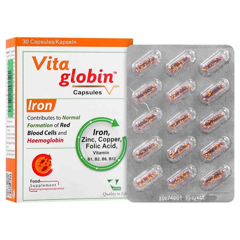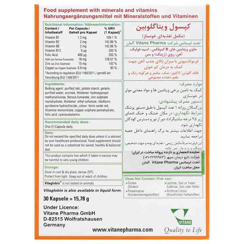 کپسول ویتاگلوبین ویتان، یک مکمل تغذیهای، برای کمک به خون سازی، درمان کم خونی و تامین مورد نیاز برخی مواد مغذی بدن تولید شده است. کپسول ویتاگلوبین دارای آهن، زینک، مس و گروهی از ویتامینهای B است. این مکمل آهن در بسته بندی 30 عددی، به فرم کپسول توسط شرکت دارو درمان سپهر و تحت لیسانس ویتان فارما آلمان تولید شده است. آهن موجود در این محصول به فرم فومارات می باشد و باعث جذب بیشتر و دسترسی بالای آهن در این مکمل شده است. هر کپسول ویتاگلوبین دارای 18 میلی گرم آهن المنتال است. همچنین این محصول فاقد گلوتن، لاکتوز، نمک، مخمر، رنگ دهنده و طعم دهنده مصنوعی است.