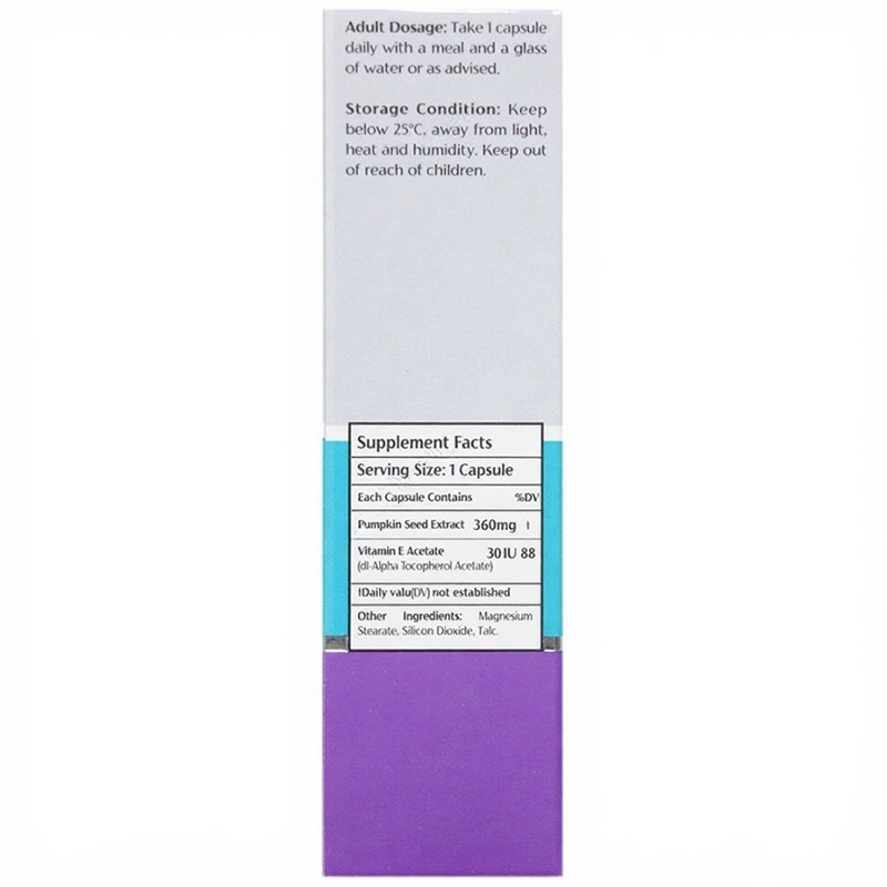 کیبی از عصاره دانه کدو و ویتامین E است و برای حمایت از سلامت پروستات، سیستم ادراری و تقویت ایمنی بدن استفاده می‌شود. عصاره دانه کدو سرشار از آنتی‌اکسیدان‌ها، ویتامین‌ها و اسیدهای چرب مفید است و می‌تواند به بهبود عملکرد پروستات و حفظ سلامت دستگاه ادراری کمک کند. وجود ویتامین E در این محصول نیز اثر محافظتی بیشتری ایجاد کرده و می‌تواند در کاهش احتمال بروز مشکلات پروستات مؤثر باشد.